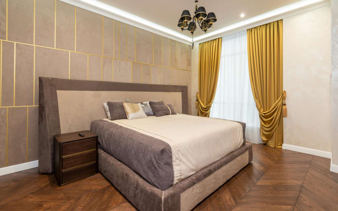 Za one koji žele da njihova spavaća soba odiše glamuroznošću i elegancijom, kombinacija tamno plave i zlatne boje je pravi izbor. Tamno plava unosi dubinu i mir, dok zlatna dodaje sofisticiranu toplinu i osećaj luksuza.